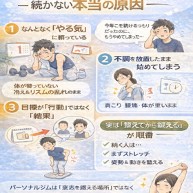 女性・男性問わず、一人ひとりの姿勢や動作を細かく分析し、パーソナライズされたサポートで“動ける身体”へ。