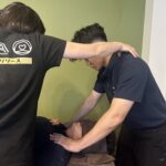 実技では、ジュラシック筋膜リリース協会オリジナルの技法を使って、頭皮→首→肩の流れを整える施術を学びました。ローラー・ハンズオン(手技)を組み合わせて、頭蓋骨から頸椎にかけての硬さをほぐす方法など。
